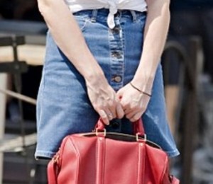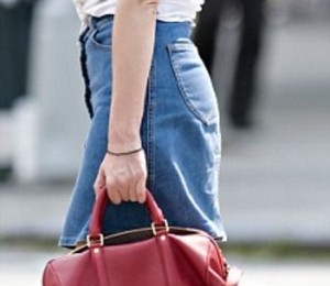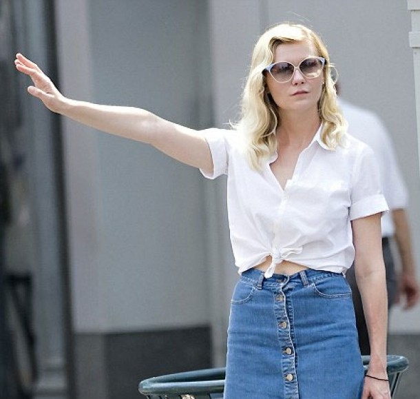 Actrita a combinat o camasa alba, legata in talie, cu o fusta din denim inchisa cu nasturi. Kirsten a completat tinuta cu o geanta rosie din piele si o pereche de sandale. Ochelarii pe care i-a ales, de culoare roz cu rama albastra, sunt la moda in randul vedetelor de la Hollywood in prezent.