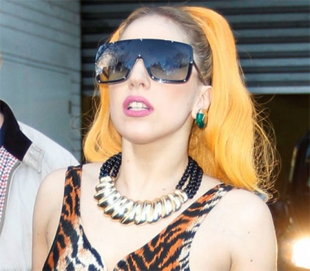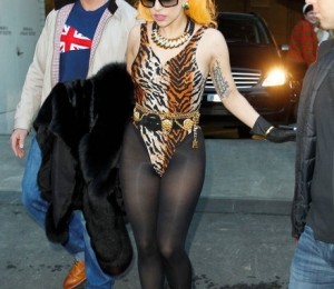 Intr-un body animal print, combinat cu o pereche de colanti negri transparenti si o pereche de ghete cu platforma si toc exagerat de inalte, Lady Gaga si-a salutat admiratorii care nu aveau cum sa o rateze, mai ales datorita nuantei intense a parului artistei.
