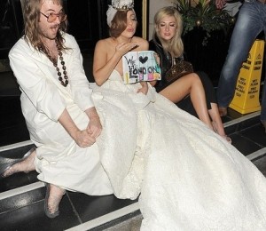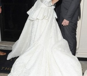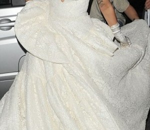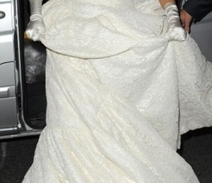 Cantareata in varsta de 26 de ani a purtat o rochie de mireasa extrem de decoltata, fara bretele, cu un val aranjat inedit, o coroana pe post de accesoriu de par si manusi albe.