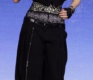 Madonna a purtat pentru acest eveniment un outfit casual format dintr-o pereche de pantaloni negri, un corset si vesta neagra. Tinuta ii scotea in evidenta talia subtire de viespe, dar, in acelasi timp, ii dezvaluia bicepsii bine lucrati si musculosi. Pana si postura corpului aduce cu cea a unei culturiste.