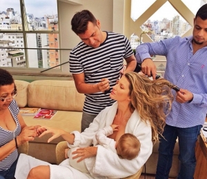 Şi supermodelul brazilian a ţinut să ne arate o imagine în care îşi alăptează copilul, la locul de muncă, pregătindu-se pentru o sesiune foto. Gisele e foarte pasionată când vine vorba de alăptat, susţine cu tărie acest obicei şi consideră că toate mamele ar trebui să fie obligate prin lege să-şi alăpteze bebeluşii pentru cel puţin 6 luni.