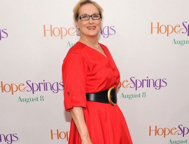 Recent, aflata la premiera din New York a peliculei "Hope Springs", Meryl Streep a ales o rochie de un rosu aprins, inspirata din moda anilor '50, care i-a pus foarte bine in valoare silueta si a intinerit-o cu ani buni.