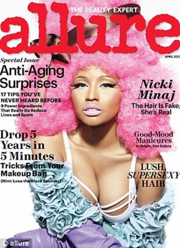 In pictorialul pentru revista, Nicki Minaj apare purtand peruci roz si portocalii, fuste largi roz si cu un decolteu generos.