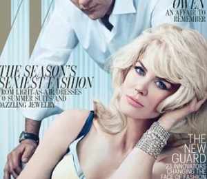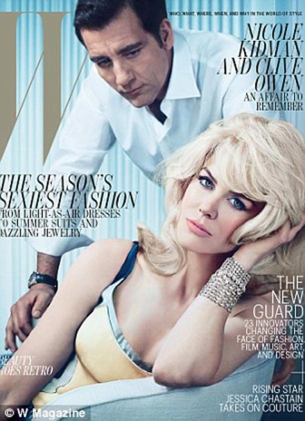 Actrita, in varsta de 44 de ani, apare pe coperta revistei W, pentru editia din luna mai. Aceasta apare in fotografii cu parul blond platinat, in diferite tinute vintage, in stilul creatiilor "Mad Men", spre deosebire de Clive Owen, care apare doar intr-un costum albastru inchis Armani.