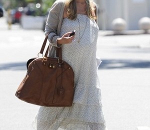 Astfel, a fost fotografiata pe strazile din Los Angeles, purtand o rochie larga, fara bretele, cu imprimeu floral si o enorma geanta maro, din piele, semnata Yves Saint Laurent.