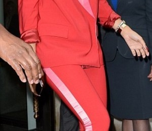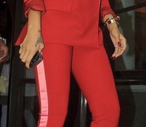 De parca o tinuta de culoare rosie in intregime nu ar fi fost de ajuns, Rihanna a ales un contrast de-a dreptul surprinzator. Atat sacoul, cat si pantalonii, prezentau detalii de culoare roz.