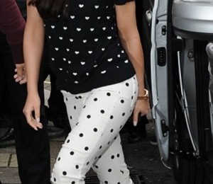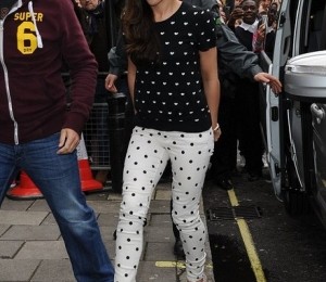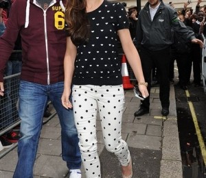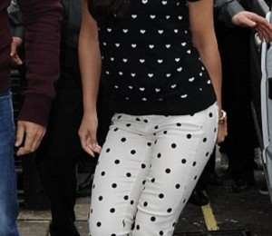 In timp ce unii ar considera suficienta o esarfa sau o curea cu buline care sa inveseleasca tinuta, Cheryl Cole a abuzat de-a binelea de acest imprimeu. Cantareata a imbulinat-o, la propriu, alegand sa poarte blugi skinny Paige Denim albi cu buline negre si pantofi intr-o nuanta nude cu buline rosii. Si nu s-a oprit aici! Bluza neagra cu inimioare albe este cireasa de pe tort.