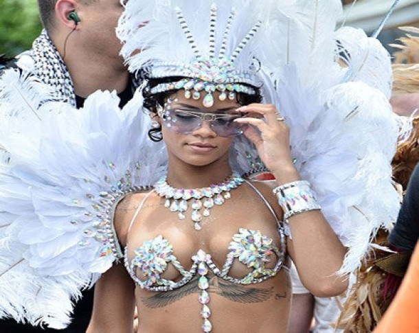 Costumul, format dintr-un sutien minimalist batut in pietre si un slip asortat, a fost accesorizat cu o pereche de aripi facute din pene.