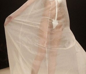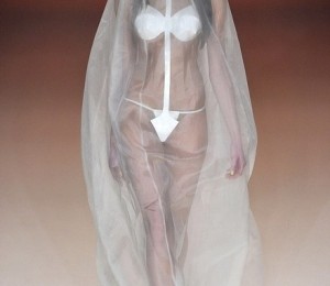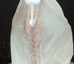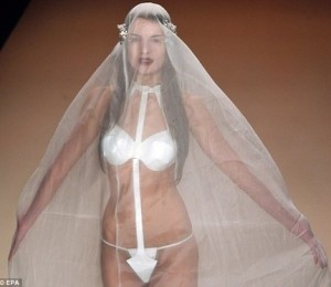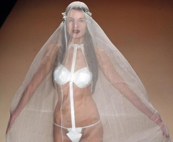 Rochia de mireasa propusa de casa de moda germana Kaviar Gauche este un model care cu siguranta le-ar face sa roseasca si pe cele mai indraznete femei. Rochia este creata in intregime din voal, lasand la vedere lenjeria intima, un sutien alb si o pereche de bikini minusculi.