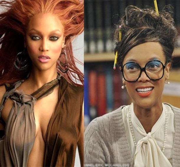 Parul strans si cu multe creioane infipte prin el, ochelari mari, machiaj strident si nepotrivit, haine de moda veche, Tyra arata foarte diferit fata de aparitiile ei obisnuite.