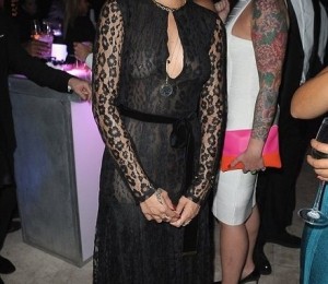 Rihanna este deja celebra pentru aparitiile ei excentrice, iar lipsa sutienului nu ar fi ceva neobisnuit pentru ea. Asa ca artista nu doar ca a iesit in oras fara sutien, dar a optat si pentru un top complet transparent in partea din fata. La petrecerea de Revelion organizata de P.Diddy, cantareata si-a facut aparitia intr-o rochie din dantela care ii lasa la vedere cercelul din sfarc.