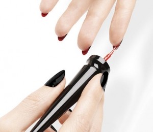 Pe buretelul aplicator, trage o dunga de oja rosie si una de oja neagra. Preseaza apoi buretelul pe varful unghiei, avand grija ca partea neagra sa se afle in partea de sus a unghiei.