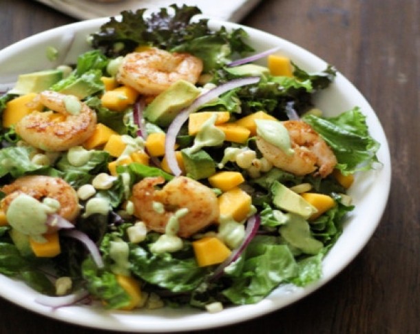 Pentru salata ai nevoie de: 1 lingura de ulei de masline, 2 catei de usturoi tocati marunt, 2 cani de creveti curatati, 1/2 salata verde, 1/2 ceapa rosie maruntita, 1 mango taiat in cubulete, 5 linguri de porumb, sare si piper.
