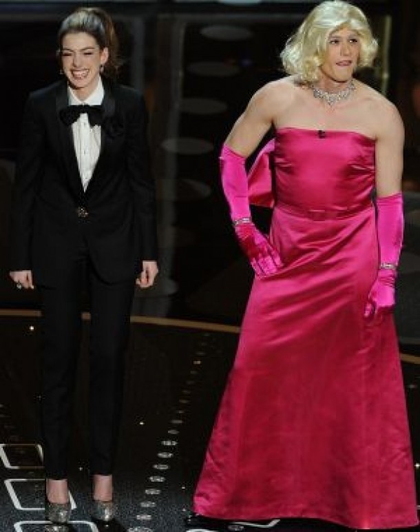 Actrita Anne Hathaway s-a imbracat intr-un costum barbatesc si a interpretat un cantec ce ar fi trebuit sa fie duet, insa a salvat-o partenerul ei, James Franco, imbracat intr-o rochie roz si cu o peruca blonda.