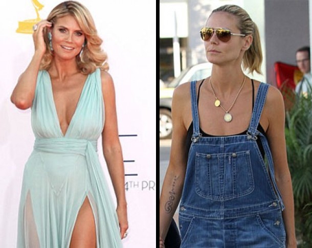 Drept dovada sta chiar aparitia lui Heidi Klum a doua zi dupa Premiile Emmy. A purtat pentru prestigiosul eveniment o creatie Alexandre Vauthier, cu un decolteu generos si doua crapaturi indraznete in fata. Dar cand paparazzii au surprins-o ulterior alaturi de familie, era parca o cu totul alta persoana. Era imbracata intr-o tinuta ponosita compusa dintr-o salopeta de blugi si un top negru.