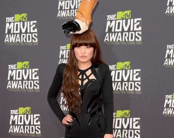 Hanna Mae Lee s-a prezentat la MTV Movie Awards intr-o rochie neagra, mulata, cu detalii din piele care ii subliniau bustul si talia, pe care a combinat-o cu o pereche de pantofi negri cu toc ascutit.