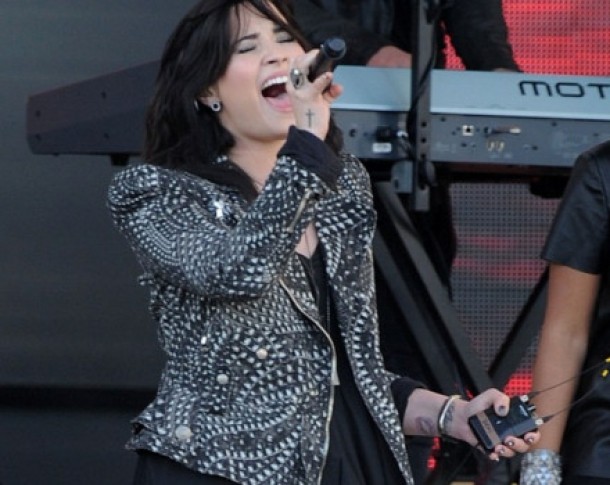 Invitata in cadrul emisiunii “Jimmy Kimmel Live!”, Demi Lovato a purtat o combinatie cu influente rock, optand pentru o jacheta cu tinte, o rochie neagra si ghete.