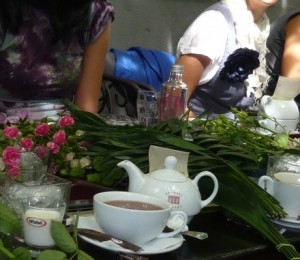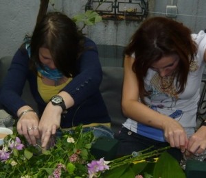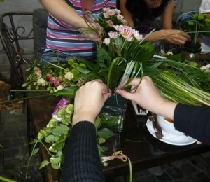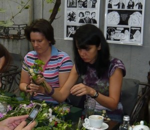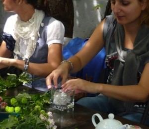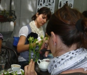 Workshop-ul de care va vorbeam s-a desfasurat intr-o atmosfera primitoare, la Lente&cafea (Str. Praporgescu 31), unde ne invaluia mireasma ceaiului de fructe proaspat facut, a cafelei, dar si a florilor. Mesele erau pline de frunze si flori de toate felurile si toate culorile, ustensile si vaze micute pentru ornamente.