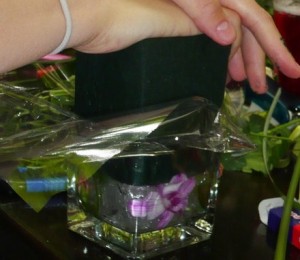 Atentie! Florile trebuie asezate cu codita spre celofan si cu bobocul spre vasul de sticla.