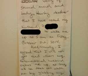 Iata ce a scris ea in contractul pe care l-a redactat pentru sotul ei: "Eu, ... , fiind in deplinatatea facultatilor mintale si sanatoasa fizic, cu aceasta decretez ca eu l-am rugat pe sotul meu, ... , sa ma trezeasca la ora 5.00 A.M. vineri, 3 octombrie 2014.