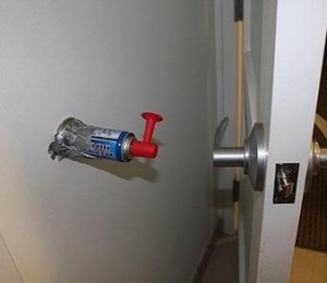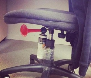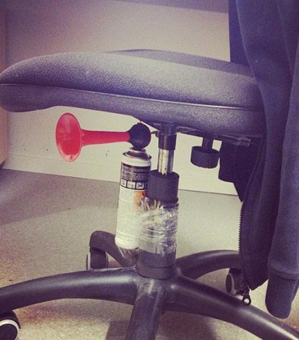 Ai o colega care mereu vine pe jumatate adormita la birou? Pune-i un claxon spray sub scaun astfel incat atunci cand se aseaza pe scaun sa se apese butonul claxonului si sa scoata un zgomot infernal.