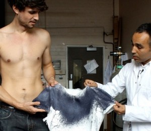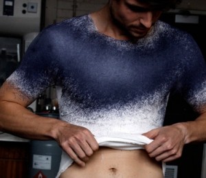 A inceput sa faca aceste tricouri acum 10 ani cand a reusit sa creeze o formula, alaturi de profesorul sau Paul Luckham. Un material creat prin pulverizare – cea mai hot tendinta in materie de moda.