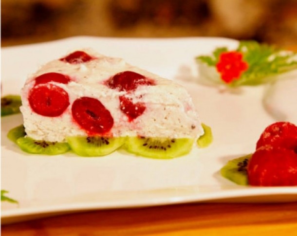 Pentru ornat: 1 pahar visine congelate; 1 kiwi taiat felii subtiri.