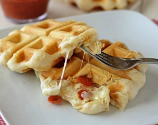 Apoi femeia a bagat cascaval feliat si carnati mici pepperoni feliati in acest buzunar creat in interior. Dupa ce a inchis aluatul, femeia l-a gatit intr-un aparat de facut vafe, timp de 3 minute. Vezi etapele care arata cum a luat nastere aceasta pizza in galeria foto de mai jos.