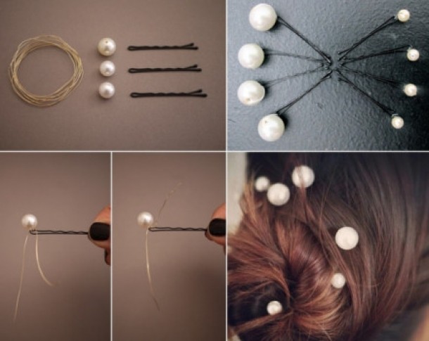 Tot ce trebuie sa faci este sa prinzi margelele de agrafe, folosindu-te de sarma subtire. La final, introdu agrafele in coc, fie pe lateral, fie in mijloc.