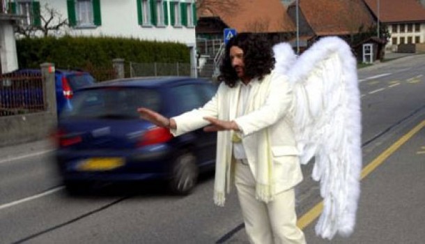 Actorul, a carui identitate nu a fost dezvaluita, imbracat intr-un costum alb si aripi cu pene, va petrece cate 20 de ore pe saptamana pe marginile drumurilor.
