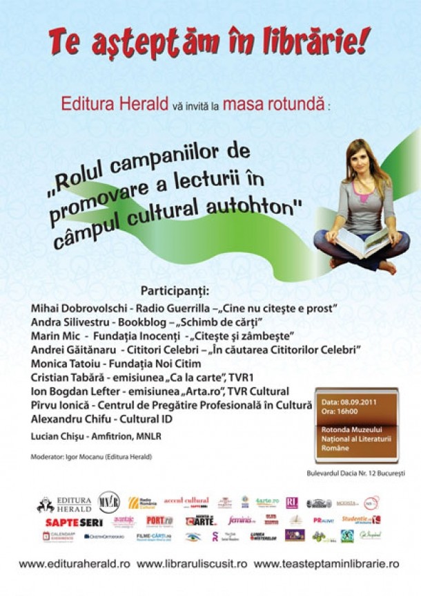 Editura Herald va fi gazda unei mese rotunde care sa puna lumina reflectoarelor pe acest fenomen tot mai larg raspandit, campaniile nationale de promovare a cititului si sa analizeze demersul lor in campul cultural autohton, intr-un schimb fertil de experienta, impresii si, de ce nu, satisfactii cu alti promotori reputati ai unor astfel de proiecte de lunga durata.