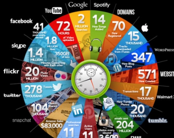 Intr-un singur minut, pe Instagram sunt urcate 216.000 de fotografii, se fac vanzari in valoare de 83.000 de dolari pe Amazon, se dau aproximativ 1.8 milioane de like-uri pe Facebook, iar pe YouTube sunt postate videoclipuri cat sa iti ajunga trei zile.