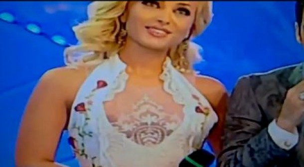 Frumoasa prezentatoare pare ca nu a respectat instructiunile de purtare a tinutei si a ramas cu sfarcul pe dinafara. Imbracata cu o rochie alba cu dantela, Iulia si-a facut aparitia in platou cu sanul la vedere.