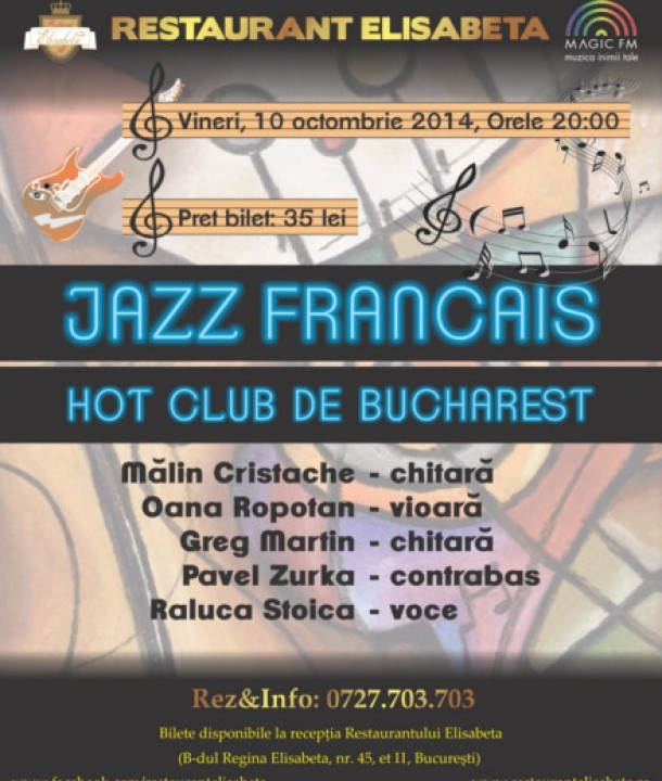 "Hot Club de Bucharest" va prezinta spectacolul lor incepand cu ora 20.00, la Restaurantul Elisabeta.