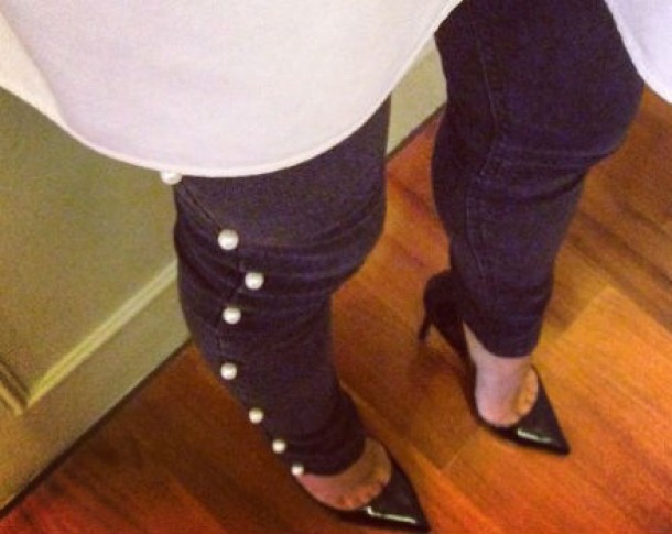 Ai nevoie de: o pereche de jeansi skinny, cateva perle, ac si ata.