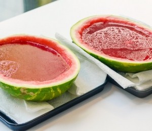 4. Toarnă compoziţia în jumătăţile de pepene şi bagă tăvile cu grijă la frigider pentru 4 ore.