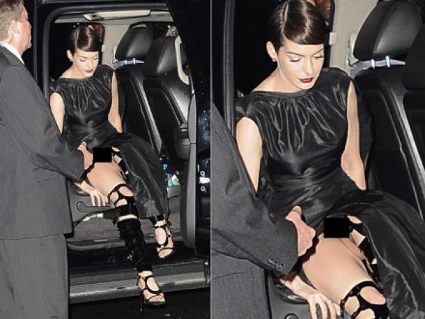 Iesind din masina, actrita nu a fost atenta la pozitia picioarelor, iar rochia ce prezenta o crapatura indrazneata a lasat-o descoperita. Din pacate, Anne Hathaway a ales sa nu poarte in seara respectiva lenjerie intima, cazand astfel prada unor comentarii acide din partea presei.