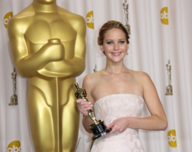 Chemata pe scena pentru a-i fi inmanat premiul pentru “Cea mai buna actrita in rol principal”, Jennifer Lawrence a intampinat unele dificultati din cauza rochiei. Tanara actrita a imbracat pentru marele eveniment o creatie Dior, care i-a garantat o aparitie spectaculoasa.