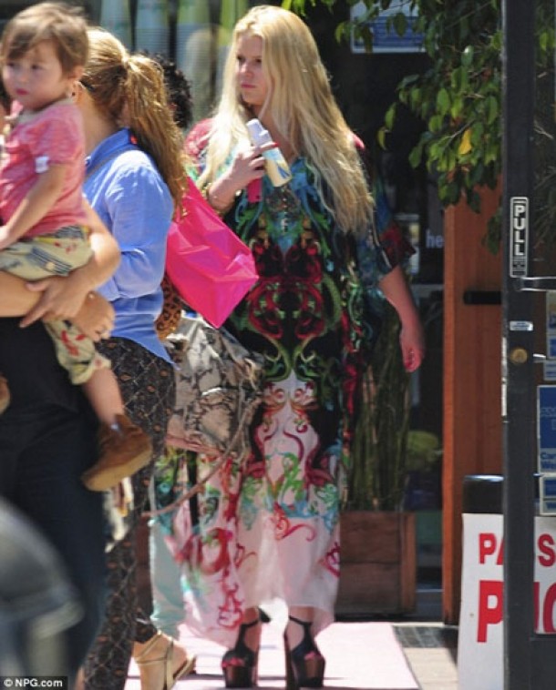 Jessica nu a reusit sa slabeasca foarte mult si drept dovada se bazeaza pe tinute lejere pentru a-si masca cat mai mult kilogramele in plus. Jessica purta o rochie maxi, foarte larga, care ii acopere imperfectiunile. Pantofii cu toc nu lipsesc nici ei si cu siguranta Jessica ii poarta pentru a parea mai inalta si sa dea impresia unei siluete mai slabe.