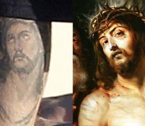 Tatuajul este inspirat de un tablou semnat de Rubens, "Ecce Homo" (Iata Omul), din anul 1610. Acesta nu este primul tatuaj al artistului. Anul trecut, in luna mai, Justin si tatal sau si-au facut tatuaje asemanatoare, scrise in ebraica, pe coaste. In plus, Justin mai are un tatuaj cu o pasare.