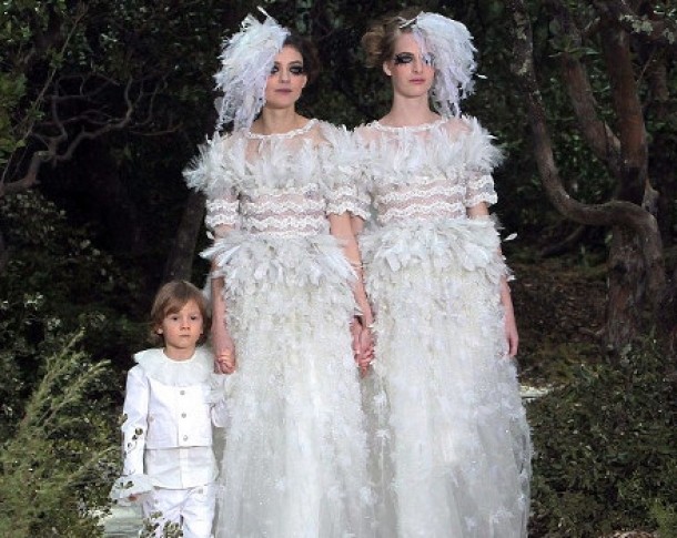 Cele doua au pasit pe podium tinandu-se de mana, fiind acompaniate si de un baietel imbracat in alb, finul lui Lagerfeld.