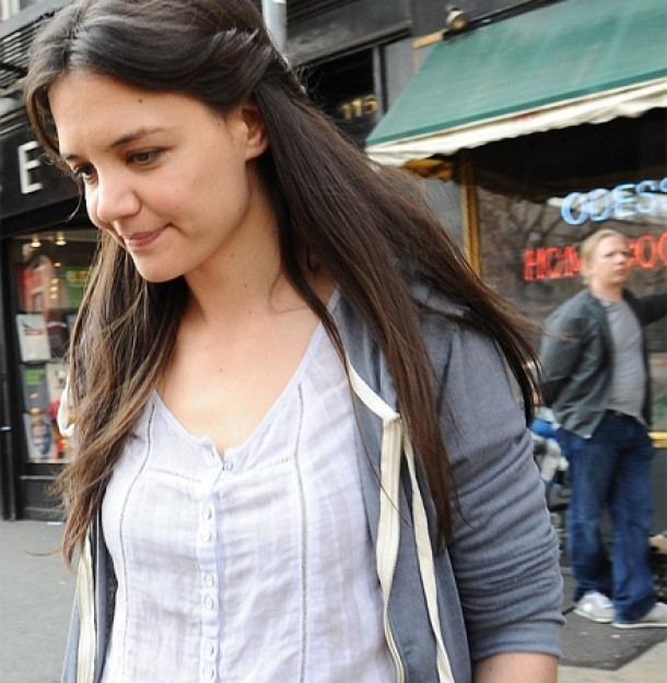 Fara machiaj, Katie Holmes afiseaza un ten impecabil, fara imperfectiuni, singurul neajuns al aparitiei actritei fiind cearcanele, inevitabile cand ai un program incarcat si un copil de crescut.