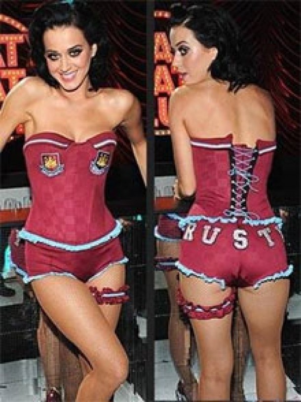 Daca lenjeria intima era creata doar din texturi fine si insertii, special aranjate pentru a exprima senzualitate, Katy Perry a mai adaugat un condiment – fotbalul, purtand un corset si o pereche de boxeri cu insemnele echipei favorite de fotbal al iubitului ei actual, Russell Brand.