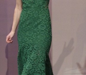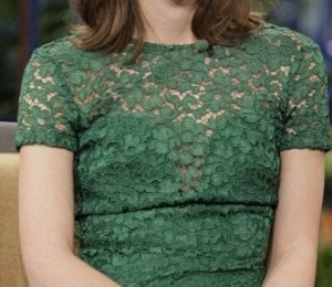 A purtat o rochie verde din dantela, care i-a pus in evidenta silueta si i-a sporit frumusetea naturala. Tinuta a fost completata de o pereche de pantofi stiletto nude, care i-au subliniat picioarele.