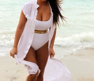 Kim a optat pentru un costum de baie alb, pe care l-a accesorizat in talie cu o curea aurie pentru a-si sublinia talia de viespe, dar care insa parea a fi foarte incomod. Era atat de stransa incat bruneta parea ca nu poate respira. Pe deasupra, a purtat o camasa din voal, menita sa o acopere de ochii curiosi, nu prea eficienta insa din cauza materialului usor transparent.