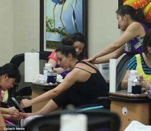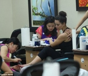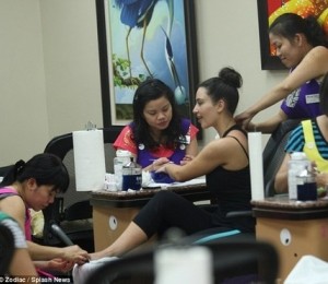 Frumoasa bruneta se afla intr-un salon de infrumusetare pentru un rasfat ca la carte care a fost intrerupt de prezenta fotografilor curiosi. Kim avea un look complet natural si parul era strans intr-un coc lejer, semn ca nu era tocmai pregatita pentru a poza pentru jurnalisti. Aceasta nu a parut insa prea deranjata de prezenta lor si a fost mult mai preocupata de indicatiile date stilistelor pentru ca nu cumva sa ii strice manichiura sau pedichiura.