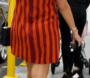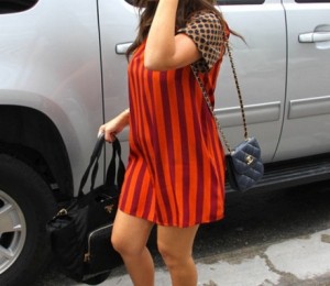 Vedeta in varsta de 32 de ani a imbracat o rochie portocalie, cu dungi orizontale pentru a crea un efect optic de subtiere. A accesorizat rochia scurta cu o pereche de sandale nude cu siret, reusind astfel sa isi puna in evidenta picioarele si totodata sa para mai inalta.