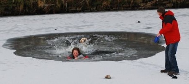 Din momentul in care a ajuns in lac, femeia a strigat dupa ajutor, iar prietenul ei a auzit si a venit in fuga pentru a o salva. Cainele a reusit sa inoate pana spre marginea lacului si a fost si el scos din apa inghetata.