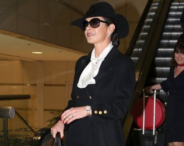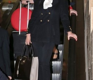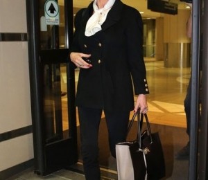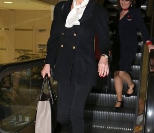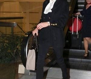 Aflata pe aeroportul din Los Angeles, actrita arata impecabil intr-o tinuta all-black, compusa dintr-o pereche de pantaloni mulati si un sacou.