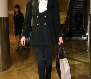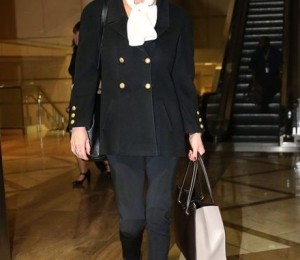 A purtat combinatia cu o pereche de ghete negre si o palarie chic, la gat avand legata o esarfa alba, detaliu care contrasta cu intreaga tinuta, luminandu-i chipul.